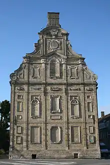 Pignon à gradins et pignon à volutes de style flamand du musée des Augustins d'Hazebrouck, Flandre française. Pignon à gradins et pignon à volutes de style flamand du musée des Augustins d'Hazebrouck, Flandre française.