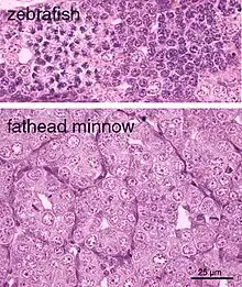- Kathleen M. Jensen, Joseph J. Korte, Michael D. Kahl et Mumtaz S. Pasha, « Aspects of basic reproductive biology and endocrinology in the fathead minnow (Pimephales promelas) », Comparative Biochemistry and Physiology Part C: Toxicology & Pharmacology, vol. 128, , p. 127–141 (DOI 10.1016/S1532-0456(00)00185-X, lire en ligne, consulté le )