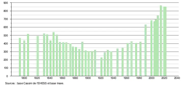 L'évolution du nombre d'habitants est connue à travers les recensements de la population effectués dans la commune depuis 1793. Pour les communes de moins de 10 000 habitants, une enquête de recensement portant sur toute la population est réalisée tous les cinq ans, les populations légales des années intermédiaires étant quant à elles estimées par interpolation ou extrapolation[16]. Pour la commune, le premier recensement exhaustif entrant dans le cadre du nouveau dispositif a été réalisé en 2004[17].