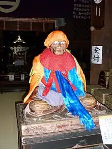 Afin qu'il veille sur la santé des bébés, on lui offre souvent des bavoirs rouges et blancs et des bonnets d'enfants, de sorte que sa statue est souvent parée de haillons. Il est représenté en peinture comme un vieillard assis sur un rocher, tenant à la main un sceptre (shaku japonais), ou une boîte à sutra et un éventail en plumes. Tous les autres Arahants sont vénérés au Japon en sa personne [4].