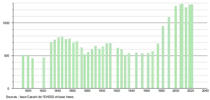 L'évolution du nombre d'habitants est connue à travers les recensements de la population effectués dans la commune depuis 1793. Pour les communes de moins de 10 000 habitants, une enquête de recensement portant sur toute la population est réalisée tous les cinq ans, les populations légales des années intermédiaires étant quant à elles estimées par interpolation ou extrapolation[22]. Pour la commune, le premier recensement exhaustif entrant dans le cadre du nouveau dispositif a été réalisé en 2008[23].