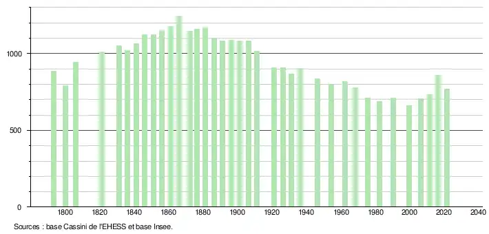 L'évolution du nombre d'habitants est connue à travers les recensements de la population effectués dans la commune depuis 1793. Pour les communes de moins de 10 000 habitants, une enquête de recensement portant sur toute la population est réalisée tous les cinq ans, les populations légales des années intermédiaires étant quant à elles estimées par interpolation ou extrapolation[24]. Pour la commune, le premier recensement exhaustif entrant dans le cadre du nouveau dispositif a été réalisé en 2006[25].