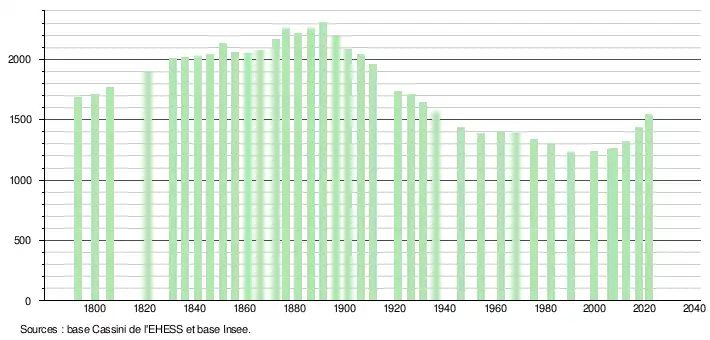 L'évolution du nombre d'habitants est connue à travers les recensements de la population effectués dans la commune depuis 1793. Pour les communes de moins de 10 000 habitants, une enquête de recensement portant sur toute la population est réalisée tous les cinq ans, les populations légales des années intermédiaires étant quant à elles estimées par interpolation ou extrapolation[22]. Pour la commune, le premier recensement exhaustif entrant dans le cadre du nouveau dispositif a été réalisé en 2007[23].