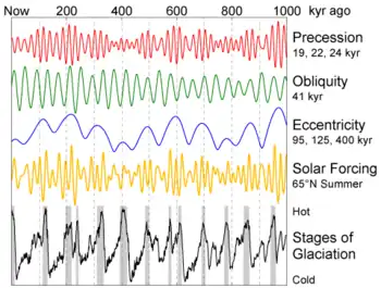 Les glaciations du Pléistocène présentent un caractère cyclique. L'hypothèse du forçage climatique par des variations de l'orbite terrestre est ancienne et soutenue par des données expérimentales cohérentes[8]. Les cycles de Milankovitch représentent le facteur principal des changements climatiques cycliques du Pléistocène, mais ils n'expliquent pas la tendance au refroidissement global sur le long terme.