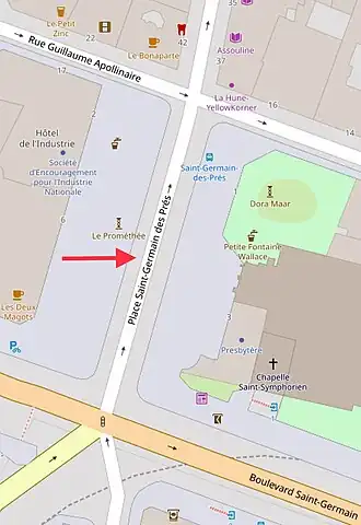 - La place est bordée à l'ouest par le café Les Deux Magots et à l'est, par l'église Saint-Germain-des-Prés et le square Laurent-Prache. La librairie-galerie YellowKorner est située en face de celui-ci, au 16 rue de l'Abbaye.