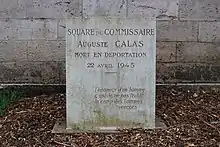 Le square, installé en contrebas du presbytère et de l'église, est nommé en hommage au commissaire Auguste Calas, arrêté le 19 septembre 1943 par la Gestapo, déporté à Romainville, Compiègne, puis quitte la France pour Buchenwald, Flossenbürg et enfin Carlsbad, où il est abattu le 22 avril 1945[21]. Une plaque y honore sa mémoire, portant l'inscription « Square du Commissaire Auguste Calas mort en déportation 22 avril 1945 » suivie des vers « l'honneur d'un homme / c'est de ne pas trahir / le camp des hommes / Vercors ». Une autre plaque est apposée sur le mur du commissariat, du côté ouest de la place.