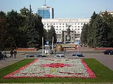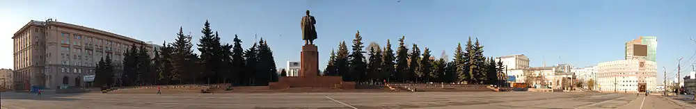 Dans les années 1950, des allées, des pelouses, des espaces verts et une fontaine en marbre et fonte, le tout prévu par le plan général de 1947, sont réalisés sur la place. La statue de Lénine est érigée en 1959[5], sur un piédestal entouré d'un podium. Les auteurs en sont les sculpteurs Zaïkov et Golovnitski et l'architecte Alexandrov.