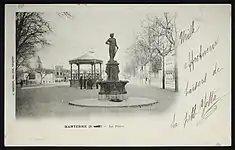 Cette marque de reconnaissance était justifiée par le legs fait à la commune en 1872 d'une propriété située au n°11 boulevard du Midi, par Jean-Baptiste Lemaître, positillon des messageries royales. Il était le fils de Thomas Lemaître, natif de Nanterre, dont la rue Thomas-Lemaître porte le nom[8]. La fontaine et la statue furent fondus sous le régime de Vichy, lors de la mobilisation des métaux non ferreux[9].
