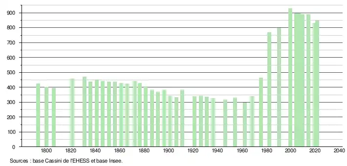 L'évolution du nombre d'habitants est connue à travers les recensements de la population effectués dans la commune depuis 1793. Pour les communes de moins de 10 000 habitants, une enquête de recensement portant sur toute la population est réalisée tous les cinq ans, les populations légales des années intermédiaires étant quant à elles estimées par interpolation ou extrapolation[35]. Pour la commune, le premier recensement exhaustif entrant dans le cadre du nouveau dispositif a été réalisé en 2004[36].