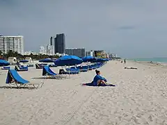 Les plages tropicales d'eau bleu-vert turquoise et de sable blanc de Miami Beach, avec ses célèbres « Lifeguard tower Art déco » de surveillance des plages, sont bordées d'immeubles, hôtels, boutiques, cafés, bars-restaurants, et de boîtes de nuits de style architectural emblématique « Art déco de Miami »[2],[3],[4].