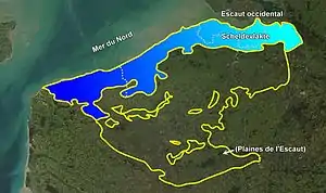 En néerlandais, la partie orientale de la plaine maritime flamande, située le long de l'Escaut occidental (bras de mer qui est l'estuaire de l'Escaut) est dénommée « Scheldevlakte » (« plaine de l'Escaut »). Mais cette subdivision n'est pas faite en français, car en français la « plaine de l'Escaut » désigne une autre zone située dans le Tournaisis en Wallonie (Belgique).