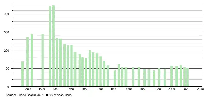 L'évolution du nombre d'habitants est connue à travers les recensements de la population effectués dans la commune depuis 1793. Pour les communes de moins de 10 000 habitants, une enquête de recensement portant sur toute la population est réalisée tous les cinq ans, les populations légales des années intermédiaires étant quant à elles estimées par interpolation ou extrapolation[15]. Pour la commune, le premier recensement exhaustif entrant dans le cadre du nouveau dispositif a été réalisé en 2007[16].