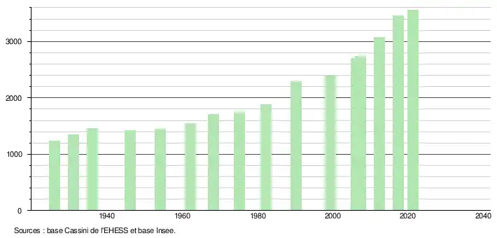 L'évolution du nombre d'habitants est connue à travers les recensements de la population effectués dans la commune depuis 1926. Pour les communes de moins de 10 000 habitants, une enquête de recensement portant sur toute la population est réalisée tous les cinq ans, les populations légales des années intermédiaires étant quant à elles estimées par interpolation ou extrapolation[22]. Pour la commune, le premier recensement exhaustif entrant dans le cadre du nouveau dispositif a été réalisé en 2007[23].