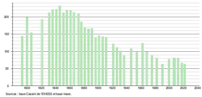 L'évolution du nombre d'habitants est connue à travers les recensements de la population effectués dans la commune depuis 1793. Pour les communes de moins de 10 000 habitants, une enquête de recensement portant sur toute la population est réalisée tous les cinq ans, les populations légales des années intermédiaires étant quant à elles estimées par interpolation ou extrapolation[15]. Pour la commune, le premier recensement exhaustif entrant dans le cadre du nouveau dispositif a été réalisé en 2007[16].
