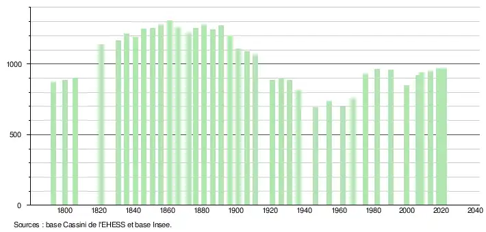 L'évolution du nombre d'habitants est connue à travers les recensements de la population effectués dans la commune depuis 1793. Pour les communes de moins de 10 000 habitants, une enquête de recensement portant sur toute la population est réalisée tous les cinq ans, les populations légales des années intermédiaires étant quant à elles estimées par interpolation ou extrapolation[26]. Pour la commune, le premier recensement exhaustif entrant dans le cadre du nouveau dispositif a été réalisé en 2008[27].