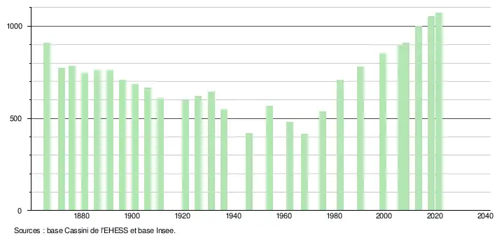 L'évolution du nombre d'habitants est connue à travers les recensements de la population effectués dans la commune depuis 1866. Pour les communes de moins de 10 000 habitants, une enquête de recensement portant sur toute la population est réalisée tous les cinq ans, les populations légales des années intermédiaires étant quant à elles estimées par interpolation ou extrapolation[26]. Pour la commune, le premier recensement exhaustif entrant dans le cadre du nouveau dispositif a été réalisé en 2008[27].