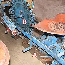 - Un soc ouvreur suivi de lames maintenant le sillon ouvert le temps d'y placer le plant ; le réglage de la hauteur du soc détermine la profondeur de plantation indépendamment du terrage ; le soc et les lames peuvent être remplacés par une paire de disques ;