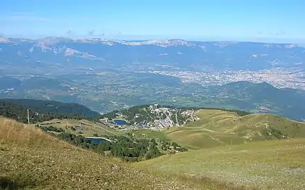 Vue depuis la Bastille en direction du sud de l'agglomération grenobloise (premier plan), du plateau de Champagnier (au second plan à gauche), du massif du Vercors (à droite) et du massif du Taillefer (en arrière-plan à gauche). | |