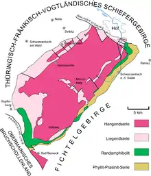 La couche la plus haute du point de vue tectono-stratigraphique, la séquence pendante, est celle des roches fortement métamorphisées et la couche la plus profonde, la séquence des phyllites-prasinites, celle des roches les moins métamorphisées : cette configuration curieuse est qualifiée de « zonage inverse. » La pile entière, à son tour, est déposée sur les unités pas ou faiblement métamorphiques du « faciès bavarois » des monts de Thuringe-Franconie.