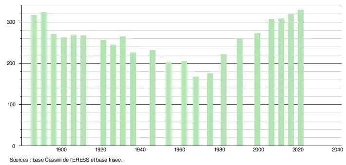 L'évolution du nombre d'habitants est connue à travers les recensements de la population effectués dans la commune depuis 1886. Pour les communes de moins de 10 000 habitants, une enquête de recensement portant sur toute la population est réalisée tous les cinq ans, les populations légales des années intermédiaires étant quant à elles estimées par interpolation ou extrapolation[35]. Pour la commune, le premier recensement exhaustif entrant dans le cadre du nouveau dispositif a été réalisé en 2006[36].
