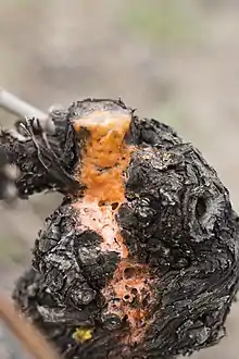 En anglais le phénomène est surnommé « vomi de cerf » (deer vomit)[3] du a son analogie avec un dépôt orange sur les ceps.