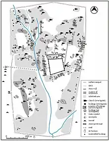 Le remblai de terre, long de 21 kilomètres et protégeant un territoire de 2300 hectares, fut probablement le premier élément défensif érigé pour assurer la sécurité de l’établissement semi-permanent ou permanent[4]. En effet, le territoire est très vaste et la construction d’une telle structure est relativement simple. Ainsi, cette protection devait assurer les limites du site tout en offrant la sécurité minimale nécessaire. Sans qu’il ne soit possible d’expliquer précisément la raison de l’immense territoire ceinturé par le remblai, il se peut que ce fût pour assurer un espace de pâture pour le bétail ainsi que des espaces suffisants pour une agriculture de base.