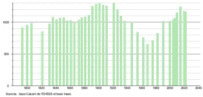 L'évolution du nombre d'habitants est connue à travers les recensements de la population effectués dans la commune depuis 1793. Pour les communes de moins de 10 000 habitants, une enquête de recensement portant sur toute la population est réalisée tous les cinq ans, les populations légales des années intermédiaires étant quant à elles estimées par interpolation ou extrapolation[47]. Pour la commune, le premier recensement exhaustif entrant dans le cadre du nouveau dispositif a été réalisé en 2004[48].