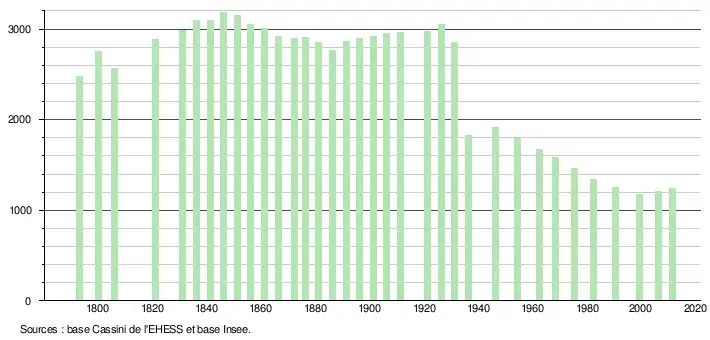 L'évolution du nombre d'habitants est connue à travers les recensements de la population effectués dans la commune depuis 1793. À partir du , les populations légales des communes sont publiées annuellement dans le cadre d'un recensement qui repose désormais sur une collecte d'information annuelle, concernant successivement tous les territoires communaux au cours d'une période de cinq ans. Pour les communes de moins de 10 000 habitants, une enquête de recensement portant sur toute la population est réalisée tous les cinq ans, les populations légales des années intermédiaires étant quant à elles estimées par interpolation ou extrapolation[41]. Pour la commune, le premier recensement exhaustif entrant dans le cadre du nouveau dispositif a été réalisé en 2006[42],[Note 1].