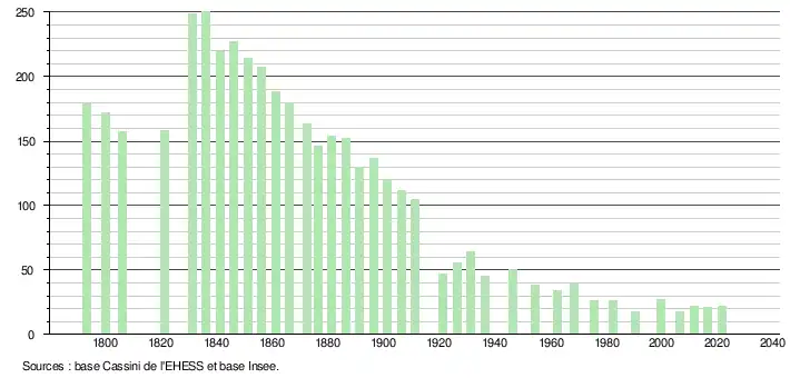 L'évolution du nombre d'habitants est connue à travers les recensements de la population effectués dans la commune depuis 1793. Pour les communes de moins de 10 000 habitants, une enquête de recensement portant sur toute la population est réalisée tous les cinq ans, les populations légales des années intermédiaires étant quant à elles estimées par interpolation ou extrapolation[22]. Pour la commune, le premier recensement exhaustif entrant dans le cadre du nouveau dispositif a été réalisé en 2006[23].