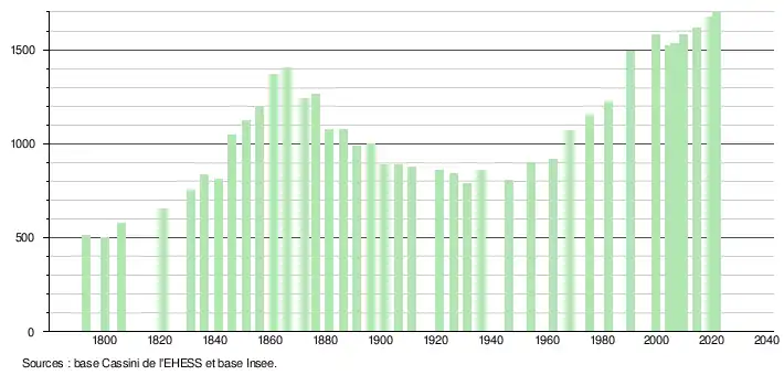 L'évolution du nombre d'habitants est connue à travers les recensements de la population effectués dans la commune depuis 1793. Pour les communes de moins de 10 000 habitants, une enquête de recensement portant sur toute la population est réalisée tous les cinq ans, les populations légales des années intermédiaires étant quant à elles estimées par interpolation ou extrapolation[42]. Pour la commune, le premier recensement exhaustif entrant dans le cadre du nouveau dispositif a été réalisé en 2004[43].