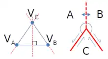 Par conséquent, par rapport au triangle dans l'espace des vitesses, le point devra dans ce cas se situer sur la droite passant par et . De plus, on peut noter que dans ce cas, la direction de la frontière (AB) est donc la même que celle de . Noter cependant que dans ce cas, la position relative des deux plaques de part et d'autre de la frontière n'est pas directement déterminée, conduisant potentiellement à deux solutions dans l'espace géologique suivant que la faille transformante est lévogyre ou dextrogyre.