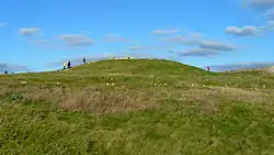 Bien plus tard, un tumulus comportant deux cairns superposés est érigé au sommet du promontoire granitique. Le cairn supérieur contient deux monuments mégalithiques :