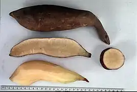 La texture et la saveur rappellent la pomme et la pastèque. Le tubercule est principalement composé d'eau et de fructo-oligosaccharides. Il contient également de l'inuline, un sucre indigeste, ce qui signifie que, même s'ils ont une saveur sucrée, les tubercules contiennent peu de calories[réf. souhaitée].
