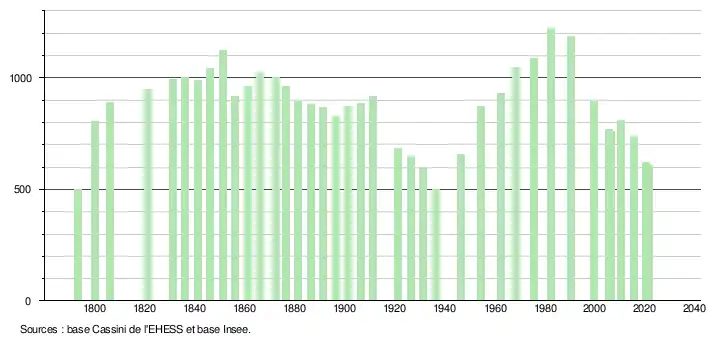 L'évolution du nombre d'habitants est connue à travers les recensements de la population effectués dans la commune depuis 1793. Pour les communes de moins de 10 000 habitants, une enquête de recensement portant sur toute la population est réalisée tous les cinq ans, les populations légales des années intermédiaires étant quant à elles estimées par interpolation ou extrapolation[19]. Pour la commune, le premier recensement exhaustif entrant dans le cadre du nouveau dispositif a été réalisé en 2005[20].