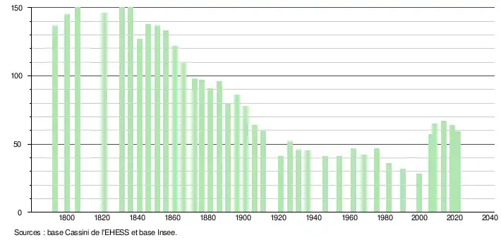 L'évolution du nombre d'habitants est connue à travers les recensements de la population effectués dans la commune depuis 1793. Pour les communes de moins de 10 000 habitants, une enquête de recensement portant sur toute la population est réalisée tous les cinq ans, les populations légales des années intermédiaires étant quant à elles estimées par interpolation ou extrapolation[16]. Pour la commune, le premier recensement exhaustif entrant dans le cadre du nouveau dispositif a été réalisé en 2008[17].