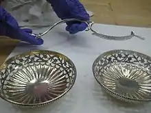 Couteaux et couverts de polissage sont connus pour le vitrage amende ou le vitrage bleu. Le sale de polissage, lorsqu'il est utilisé, sur l'argent allemand, le métal blanc... est techniquement une opération de polissage car il utilise un abrasif en vrac, mais il enlève une quantité importante de matériel, tout comme le polissage.