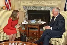 Réunion entre l'Américain Tillerson et la Canadienne Freeland en 2017, représentant des pays alliés dans le cadre de l'ALÉNA.