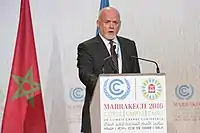 Par ailleurs, le gouvernement Bainimarama à partir des années 2010 fait de la mobilisation de la communauté internationale sur les enjeux du développement durable et la lutte contre le réchauffement climatique le cœur de la politique étrangère fidjienne. Le pays parvient à atteindre une certaine « prééminence dans les affaires mondiales » en étant élu à la présidence du Groupe des 77 pour l'année 2013, devenant le premier pays des îles du Pacifique à présider cette coalition de cent-trente-deux pays en développement aux Nations unies[30]. En 2017, les Fidji, représentées par le Premier ministre Bainimarama, président la COP23, la Conférence des Nations unies de 2017 sur les changements climatiques, consolidant ainsi leur rôle de principal porte-parole des petits États insulaires en développement en matière de lutte contre le réchauffement climatique et ses conséquences[31],[32]. Ainsi la politique étrangère fidjienne dans les années 2010 continue de se caractériser entre autres « par un leadership affirmé dans [sa] région, notamment au sein des petits Etats insulaires en développement, et un fort engagement dans les négociations climatiques depuis 2010 », les Fidji étant d'ailleurs le « premier pays du monde à ratifier l’Accord de Paris en février 2016 » avant de présider la COP23[14].