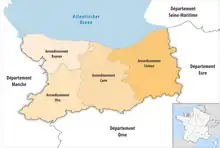 La préfecture du Calvados est localisée à Caen. Le département possède en outre trois sous-préfectures à Bayeux, Lisieux et Vire Normandie. Jusqu'en 1926, le département possédaient deux arrondissements supplémentaires à Falaise et Pont-l'Évêque.