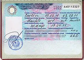 Le passeport doit être valide pendant au moins 6 mois après la date d'expiration du visa azerbaïdjanais demandé. S'il y a moins de 3 mois pour l'expiration du passeport d'un citoyen étranger, un visa ne sera pas accordé[1]. Les citoyens de certains pays énumérés, qui sont tenus d'obtenir un visa avec un passeport ordinaire ou un passeport de service, doivent obtenir un visa avant de se rendre en Azerbaïdjan[2]. Les visas sont délivrés dans une ambassade ou un consulat de la république d'Azerbaïdjan ou à l'arrivée aux points de passage frontaliers de la république d'Azerbaïdjan. Le formulaire de demande de visa peut être rempli en ligne et soumis à la mission diplomatique[3],[4].