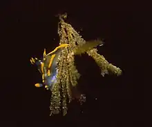 Comme les autres nudibranches, cette espèce est hermaphrodite mais la reproduction est sexuée : la ponte (ou « oothèque ») est blanchâtre. Elle prend la forme d'une spirale comprenant jusqu'à 10 000 œufs de 80 μm de diamètre reposant sur les branches d'autres invertébrés[6]. La reproduction a lieu de mars à septembre[3].