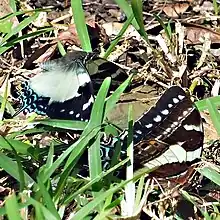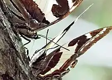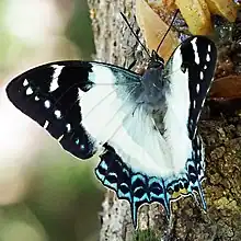 C'est un grand papillon blanc bordé de marron qui présente deux queues aux postérieures. Le dessus des ailes antérieures présente un apex et une bordure marron marqués d'une ligne submarginale et celui des ailes postérieures est bordé d'ocelles bleus centrés de marron formant une bande marginale bleu et marron.