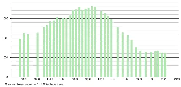 L'évolution du nombre d'habitants est connue à travers les recensements de la population effectués dans la commune depuis 1793. Pour les communes de moins de 10 000 habitants, une enquête de recensement portant sur toute la population est réalisée tous les cinq ans, les populations légales des années intermédiaires étant quant à elles estimées par interpolation ou extrapolation[27]. Pour la commune, le premier recensement exhaustif entrant dans le cadre du nouveau dispositif a été réalisé en 2005[28].