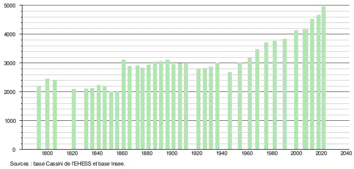 L'évolution du nombre d'habitants est connue à travers les recensements de la population effectués dans la commune depuis 1793. Pour les communes de moins de 10 000 habitants, une enquête de recensement portant sur toute la population est réalisée tous les cinq ans, les populations légales des années intermédiaires étant quant à elles estimées par interpolation ou extrapolation[28]. Pour la commune, le premier recensement exhaustif entrant dans le cadre du nouveau dispositif a été réalisé en 2007[29].