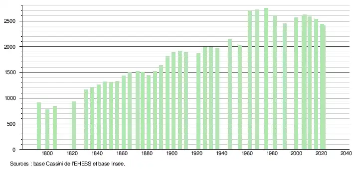 L'évolution du nombre d'habitants est connue à travers les recensements de la population effectués dans la commune depuis 1793. Pour les communes de moins de 10 000 habitants, une enquête de recensement portant sur toute la population est réalisée tous les cinq ans, les populations légales des années intermédiaires étant quant à elles estimées par interpolation ou extrapolation[30]. Pour la commune, le premier recensement exhaustif entrant dans le cadre du nouveau dispositif a été réalisé en 2005[31].