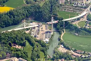 Le système fut associé à celui des ponts en console par Leinekugel Lecocq[2] au pont de Lézardrieux en 1925 dans un système un peu compliqué. L’année suivante, Eduardo Torroja construisait l’aqueduc de Tempul près de Jerez ; pour éviter de fonder une pile en rivière, il porta la travée centrale de 17 m à 34 m et en soulagea le poids par deux jeux de câbles qu’il suspendit aux pylônes. Il obtint ensuite la tension désirée en actionnant des vérins placés sous le passage des câbles au sommet des pylônes.