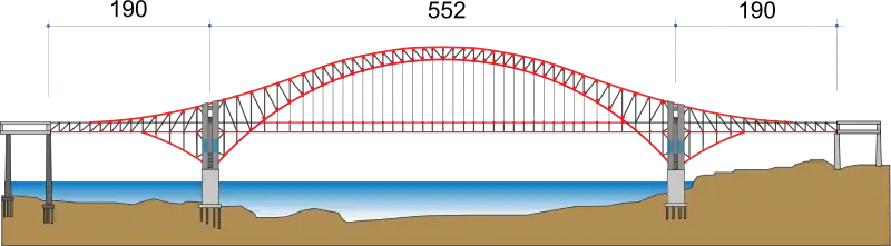 Le pont principal est un pont en arc de type bow-string à trois travées continues. Les travées latérales sont constituées de treillis de hauteur variable, et la travée du milieu est un arc en treillis en acier encastré à chacune de ses extrémités. La hauteur entre le sommet de l’arc et le milieu de la travée est de 142 m. La corde de l’arc inférieur est une parabole de 128 m au sommet, et l’élancement, le ratio hauteur /travée, de est 1/4,3125. La poutre centrale est constituée d’un treillis en N (type poutre Pratt) de hauteur variable. Celle-ci est de 14 m est à mi-travée et de 11,83 m en extrémité. Du fait de cette hauteur variable, les montants des panneaux du treillis ont des longueurs respectives de 12 m, 14 m et 16 m[3].