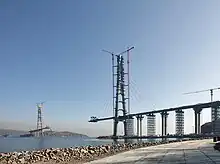 Le pont autoroutier, à 2 × 2 voies, est constitué de pylônes d'une hauteur de 320 m sur lesquels sont reliés 168 haubans et 103 caissons d'acier orthotropes qui constituent le tablier. Il a été construit dans des conditions de températures extrêmes allant de 37 °C l'été à −31 °C l'hiver[1].