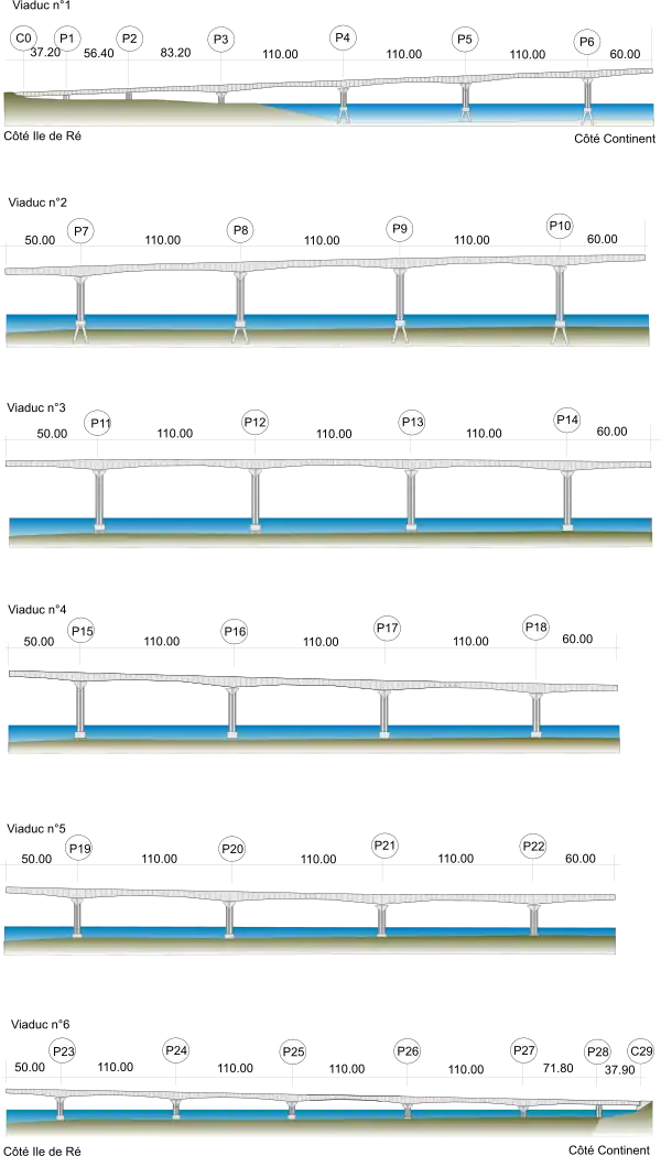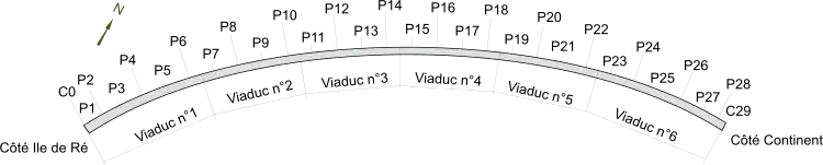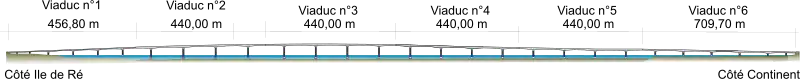 Le pont de l'Île de Ré est constitué de six viaducs distincts reliés entre eux par des joints de chaussée. L'ensemble de l'ouvrage présente un rayon de courbure horizontale de 5 000 mètres.