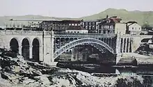 Au début du XXe siècle, les travaux de l'arc métallique central ont commencé. Le pont a été inauguré le 3 juillet 1905. Il avait une arche de 75 mètres de portée, reposant sur deux solides supports de maçonnerie, et trois arcs de chaque côté, dans lesquels des motifs ornementaux de style gothique, du goût de l'époque étaient sculptés[2]. La veille de l'inauguration, les essais de charge ont été effectués, mettant 200 tonnes en charge statique et 13 chariots de 4 tonnes chacun en charge dynamique.